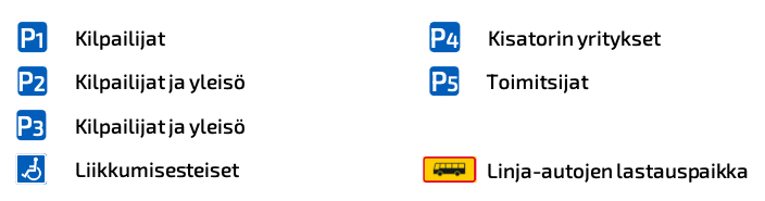 - Liikuntaesteisille on varattu omat pysäköntipaikat välittömästi urheilukentän, kisatorin ja Monikon läheisyydestä