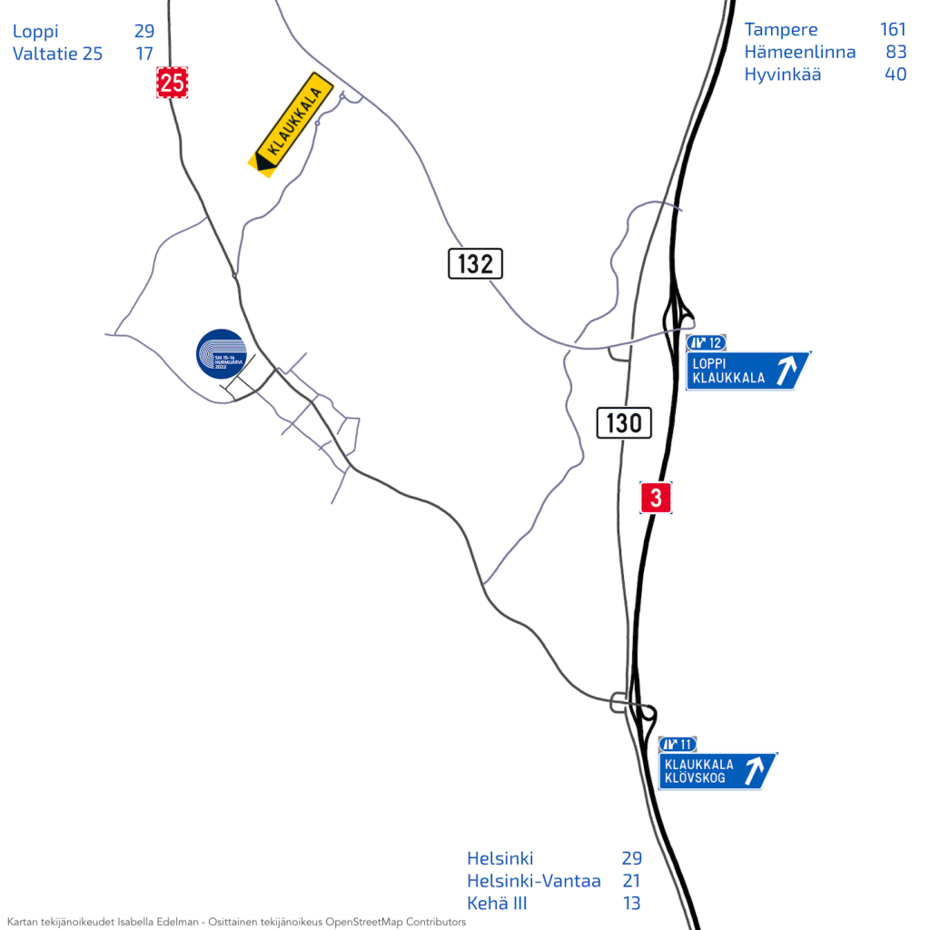 Suosittelemme Vt3:n suunnasta saapuvia ajamaan liittymän 11 kautta. Myös pohjoisempana olevassa liittymässä numero 12 on opasteet Klaukkalaan, mutta lopullinen yhteys ei ole valmis ja kiertotien opasteet ajattavat pidempää reittiä ja paikallisen asuinalueen läpi.